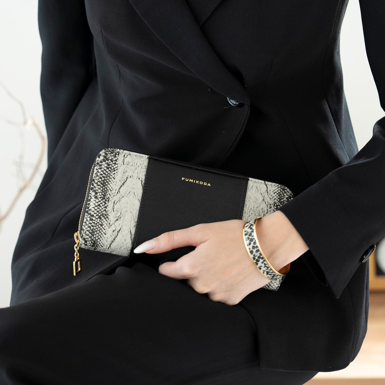 FUMIKODAの高品質な人工皮革を使用しておりエレガントなデザインに仕上げているため、クラッチバッグのように魅せられる存在感があります。