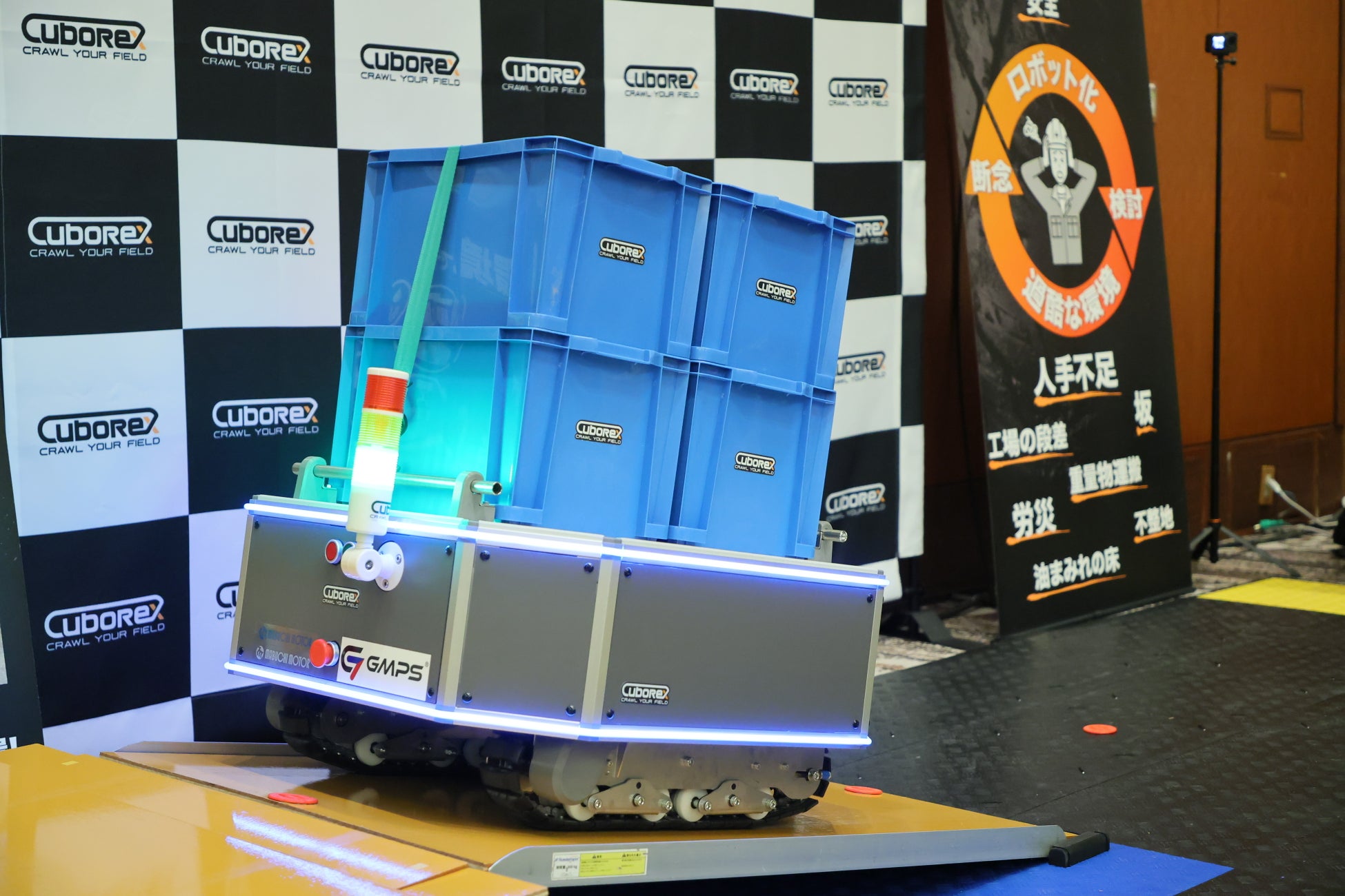 展示エリアでは実際に中小規模工場での運搬環境をイメージしたレイアウトを再現し、AGVの実機走行デモを行いました。段差や坂、滑りやすい路面でもクローラならではの安定した走行を実現し、実際に見ていただいた方々からは高い評価をいただきました。