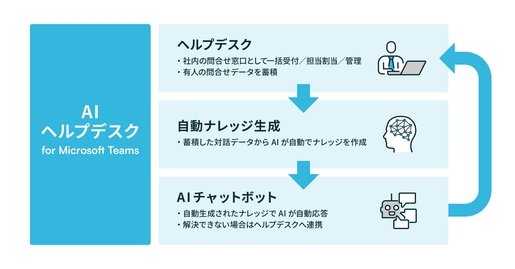 AIヘルプデスクは、PKSHAの深層学習と自然言語処理を活用したAI対話エンジンやFAQ自動生成、有人連携、問合せ管理といった複数機能がシームレスに連携することで、社内ヘルプデスクを Microsoft Teams 上で自動化するサービスです。 社内問合せに対応するバックオフィス部門、 商品および技術情報の問合せに対応する各サポート部門の各種問合せ業務をサポートし、生産性を向上させます。
