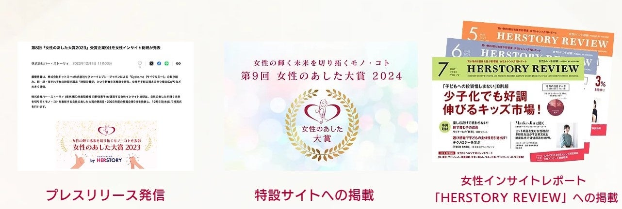 プレスリリース発信/特設サイトへの掲載/女性インサイトレポート「HERSTORY REVIEW」記事掲載/専門家からの個別総評/一般の女性モニターの参画/授賞式後PR動画のご用意