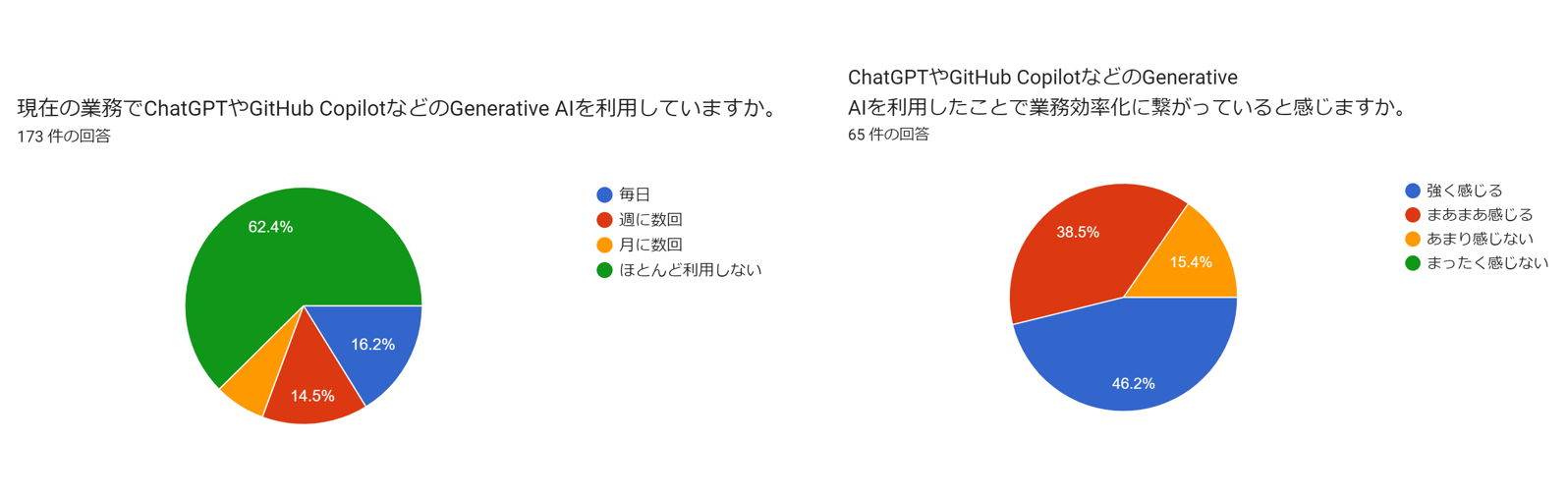 「現在の業務でChatGPTやGitHub CopilotなどのGenerative AIを利用していますか」という質問に対しては、4割の人が利用していると回答しました。「毎日利用している」「週に数回利用している」と答えた人は全体の3割とで、まだ業務活用が一般的ではない状況が伺えます。利用していると回答した人に「Generative AIの利用が業務効率化につながっているか」を聞いたところ、約5割近い人が「(業務効率化につながっている)強く感じる」と回答しており、「まあまあ感じる」と答えた人と合わせると85%の人がその効果を感じています。