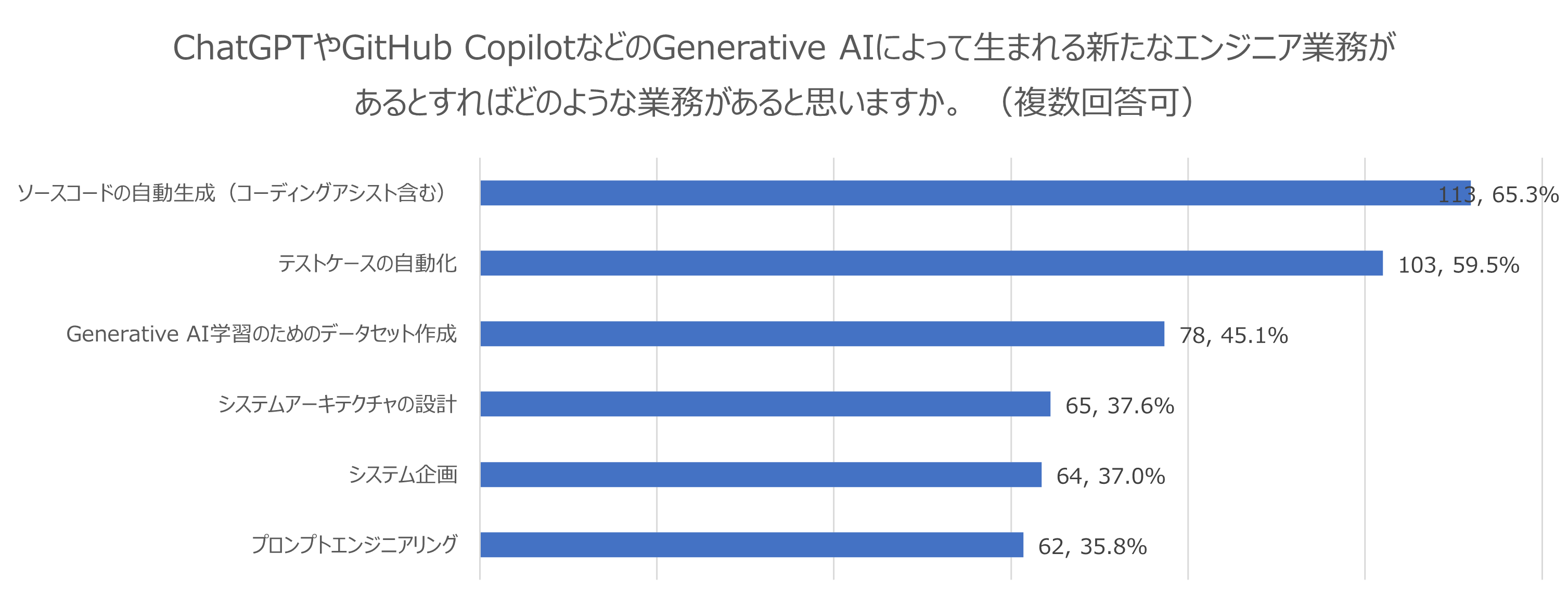 「Generative AIによって生まれる新たなITエンジニア業務があるとすればどのような業務があると思いますか」という質問に対しては「ソースコードの自動生成」(65.1%)が最も多く、次いで「テストケースの自動化」(59.9%)となりました。「システム企画」や「システムアーキテクチャ設計」と答えた人もそれぞれ40%ほどとなっており、高度な業務への活用可能性も持っていることがわかりました。また、Generative AIの活用に重要となる「プロンプトエンジニアリング」という回答も36%を占め、今後あらゆる業界での活用拡大に伴いニーズが発生すると考えている人も多いことがわかります。