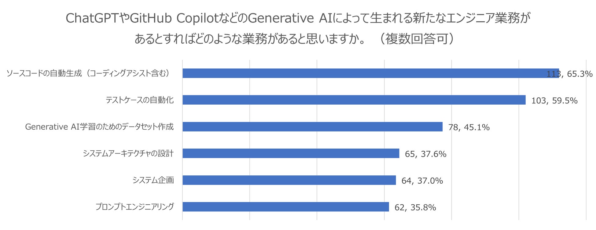 情報収集やコーディングなどの業務のほかにも、高度な業務への活用やエンドユーザーが活用し開発につなげる、高齢者などの特に理解に時間がかかるいわゆる非IT人材層との通訳としての活用に期待を寄せる人が多いことがわかりました。