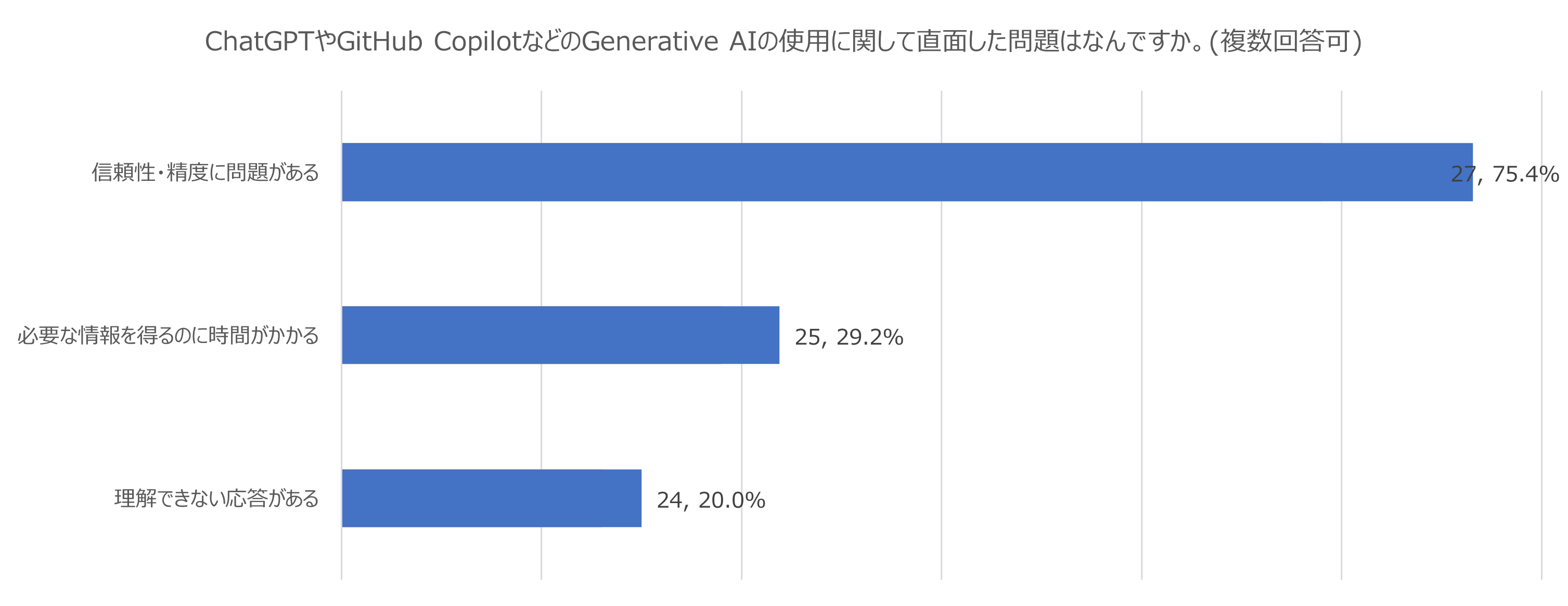 その一方で、「Generative AIの利用に関して直面した問題はなんですか」という質問に対しては8割弱の人が「信頼性・精度に問題がある」と答えており、業務における本格的な導入においては課題を持っている人が多いことがわかります。