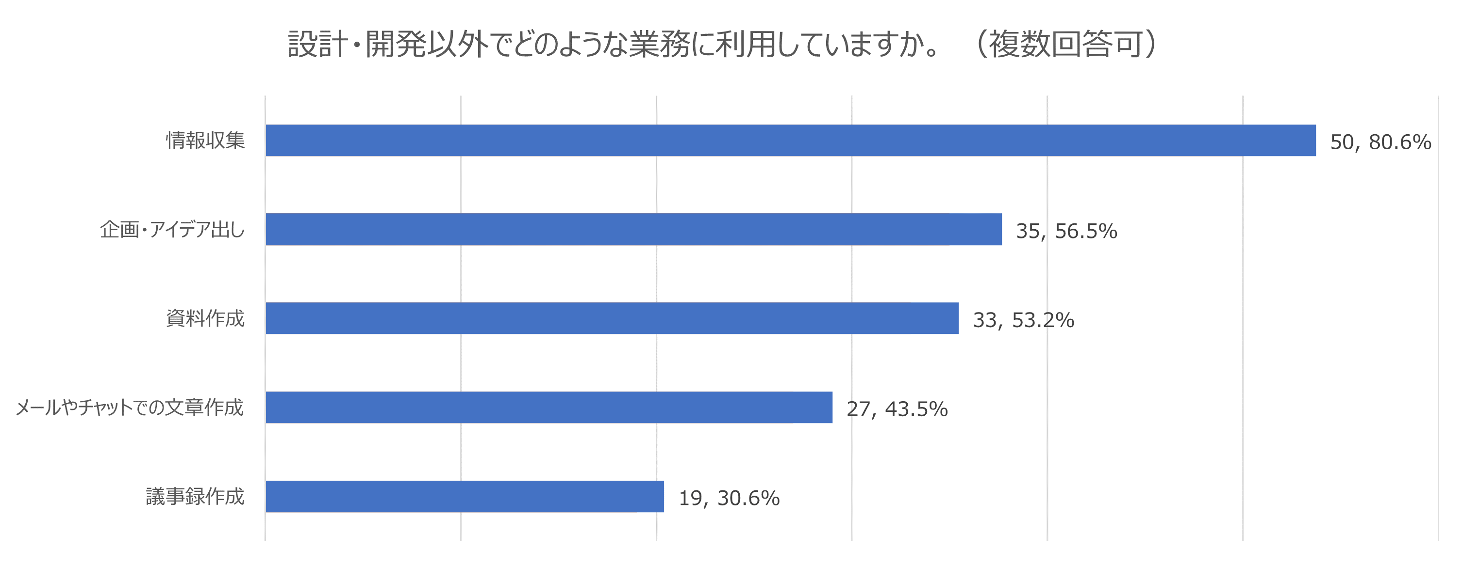利用した人を対象にGenerative AIの使途について聞いたところ、「ソースコードの記述」と答えた人が6割強を占め、次いで「ドキュメンテーションの作成」と答えた人が5割となりました。「ドキュメンテーションの要約」と答えた人も5割弱にのぼり、ITエンジニア業務においてはある程度ルールに基づいての記述業務に利用している人が多いことがわかります。また、同じく5割弱程度の人が「コミュニケーションの補助」と回答していますが、次の「設計・開発以外でどのような業務に利用していますか」の回答にあるように、メールやチャットなどにおける文章作成などに利用していると推察されます。