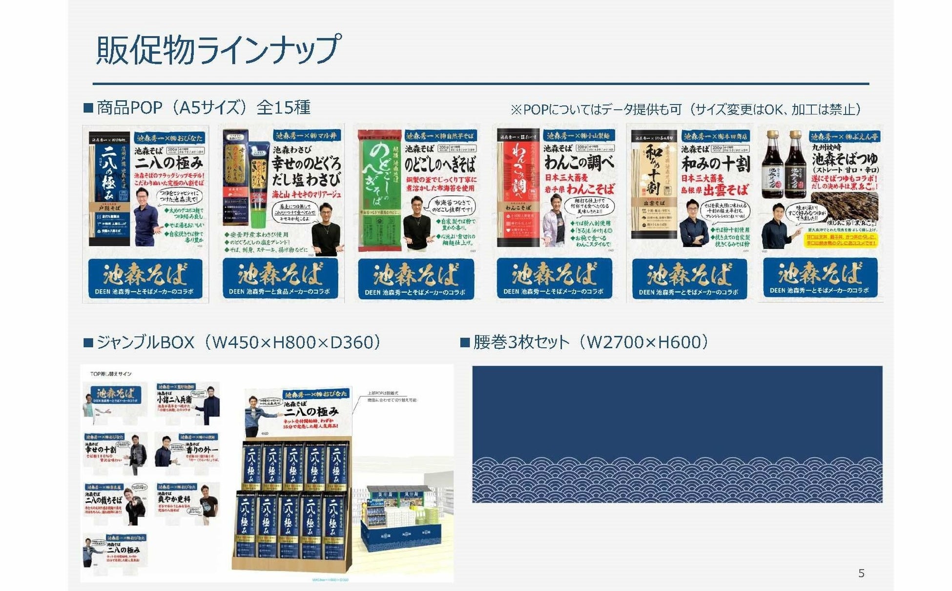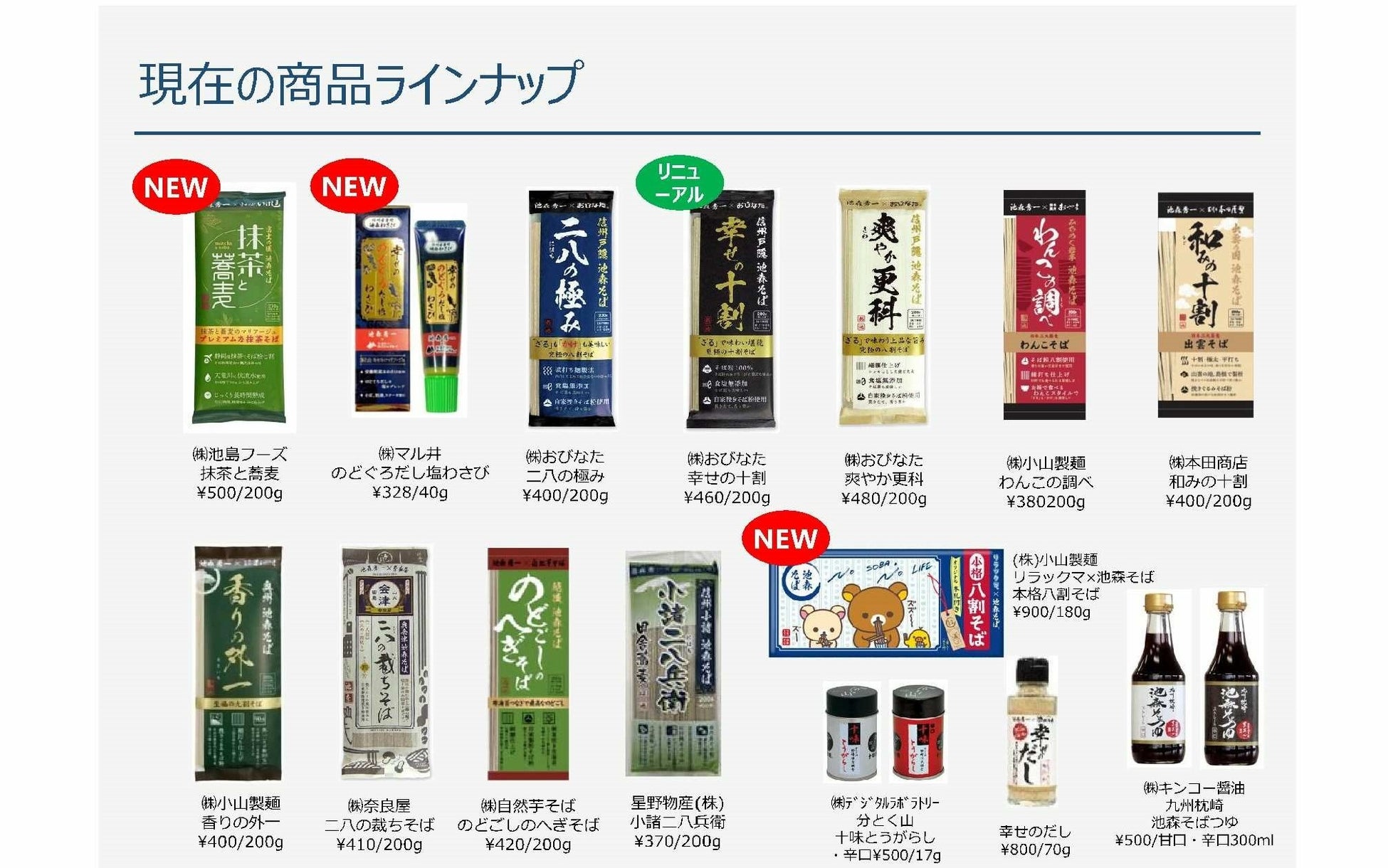 “10年間ほぼ毎日そばを食べるほどの蕎麦通”として多数のメディアでも紹介され、商品開発やYouTube配信などをとおして『池森流』のそばの楽しみ方を提案しているDEENの池森秀一さん。「池森そば」はそんなそば愛好家の池森さんが監修する商品です。当社では2020年度より専売品として取り扱いを始め、開発商品の推進やイベント、キャンペーンと絡めた販促企画を行ってきました。現在は調味料含めた全17品(乾麺11品、関連品6品/つゆ2品、わさび1品、粉末だし1品、とうがらし2品)のラインアップをご用意し、2022年度には92企業、2,245店舗に導入いただくなど、商品数・売上ともに拡大し続けている商品です。