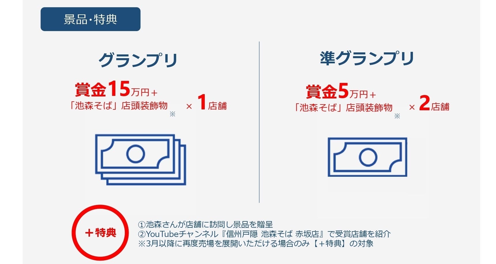 グランプリには賞金15万円+池森そば店頭装飾物、準グランプリには賞金5万円+池森そば店頭装飾物を贈呈。また特典として、池森さんが店舗に訪問し景品を贈呈&YouTubeチャンネル『信州戸隠 池森そば 赤坂店』にて受賞店舗を紹介します。
