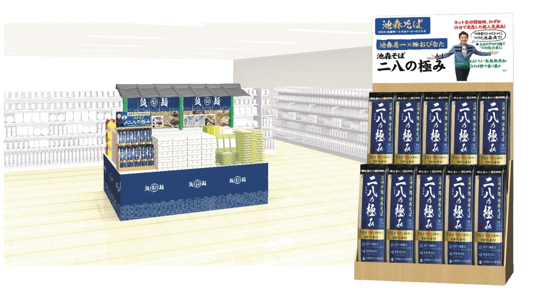 大陳コンテストでは、対象商品(池森そばの乾麺3品以上+池森そばの関連商品1品以上)を期間内に1週間以上陳列することを参加条件とし、売り場写真とエントリーシートの応募により審査を行い、グランプリ1店舗・準グランプリ2店舗を決定します。