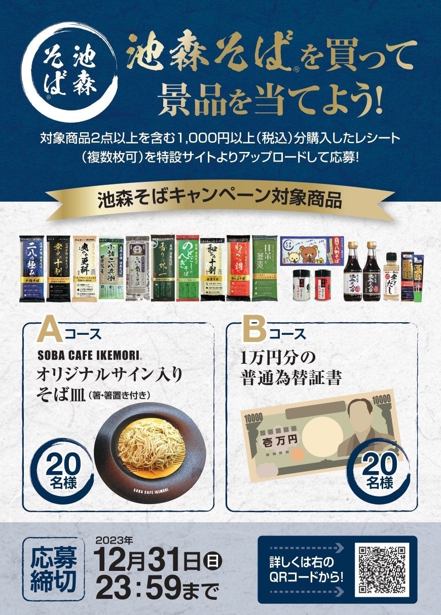 今回はさらにコンテストと同時期に購入者へ向けて、賞金1万円や池森さんサイン入りグッズが当たるキャンペーンを実施します。応募方法は、「池森そば」の商品を2点以上含む、1,000円以上購入したレシートをWebサイトからアップロード。抽選で合計40名様に景品が当たります。