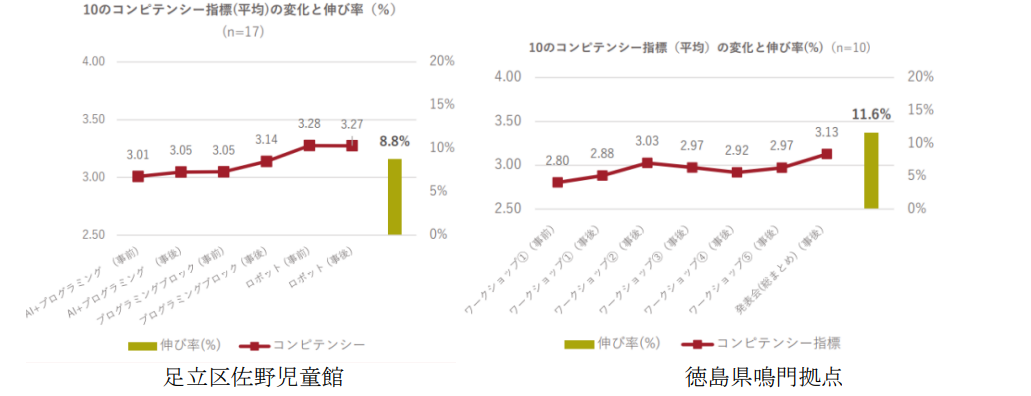 ・実施した2拠点ともに、ワークショップの回を重ねることで、子どもたちのコンピテンシーが向上したことが