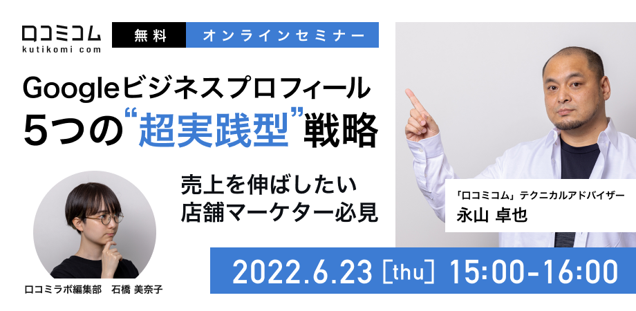 今回も講師として、「口コミコム 」のアドバイザーであり、国内で現在2名しかいない「Googleビジネスプロフィール ダイアモンドプロダクトエキスパート」としてGoogleから公式に認められている専門家でもある永山卓也氏に登壇いただきます。