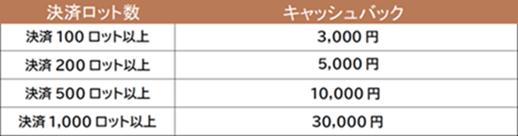 期間中に100 ロット以上決済取引されたお客様にもれなくキャッシュバック(最大3万円)いたします。