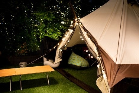 つなぐエリア各所に、人気のキャンプグッズを使用したグランピング体験、キャンプにおすすめのグルメ、