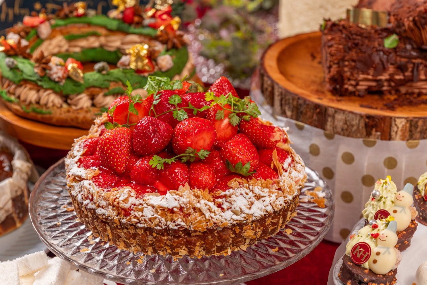 いちごたっぷりのタルト、いちごののムース、いちごのプリンアラモードに、雪だるまのスノードーム、クリスマスリース仕様のパリブレスト、ブッシュドノエルと、クリスマス気分を目でもお楽しみいただけるスイーツが並びます。お客様ご自身でクッキーにペインティングするアトラクションも登場!お食事は、いちごやチョコレートがアクセントになった洋食をお楽しみ頂けます。