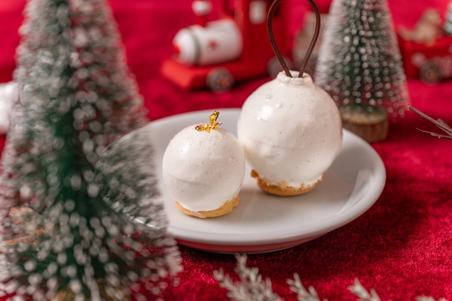 1)クリスマスリースのパリブレスト 2)ブッシュドノエル 3) クリスマスオーナメントのチョコレートムース4)スノードーム