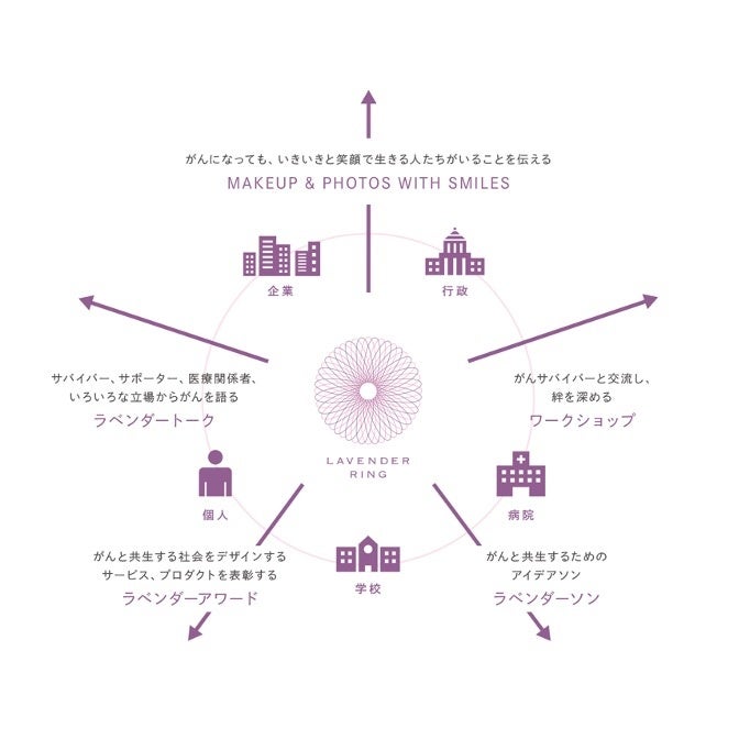 がん治療は昔と比べて格段に進化を遂げました。しかしながら、日本人の二人にひとりがなるという身近な病気にも関わらず、がんへの偏見や間違った認識はまだまだ多く存在します。これは裏を返せば、がんを正しく理解するということはこの国の多くの人を思いやることにつながる、と言えます。がんになった人はもちろん、なっていない人も共に笑顔で過ごすことができる未来へ。LAVENDER RINGはそんな思いから誕生しました。