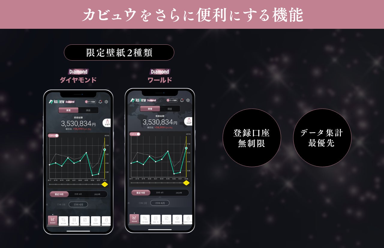 登録口座数無制限、毎日最優先でのデータ集計、2種類の限定壁紙など、カビュウのご利用をさらに便利にする機能をご利用いただけます。