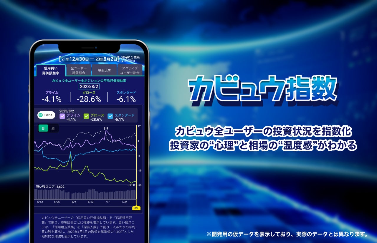 カビュウユーザーのポジショニングや投資状況を参考に、楽観的/悲観的などの相場の温度感や、ユーザーの心理状況を表す指標として開発しました。【信用買い評価損益率】【全ユーザー騰落割合】【現金比率】【アクティブユーザー割合】など、投資家の市場心理・センチメントに焦点を当てた指数であり、従来の「テクニカル分析」や「ファンダメンタルズ分析」などと合わせて、「センチメント分析」を投資判断の材料としてご活用ください。