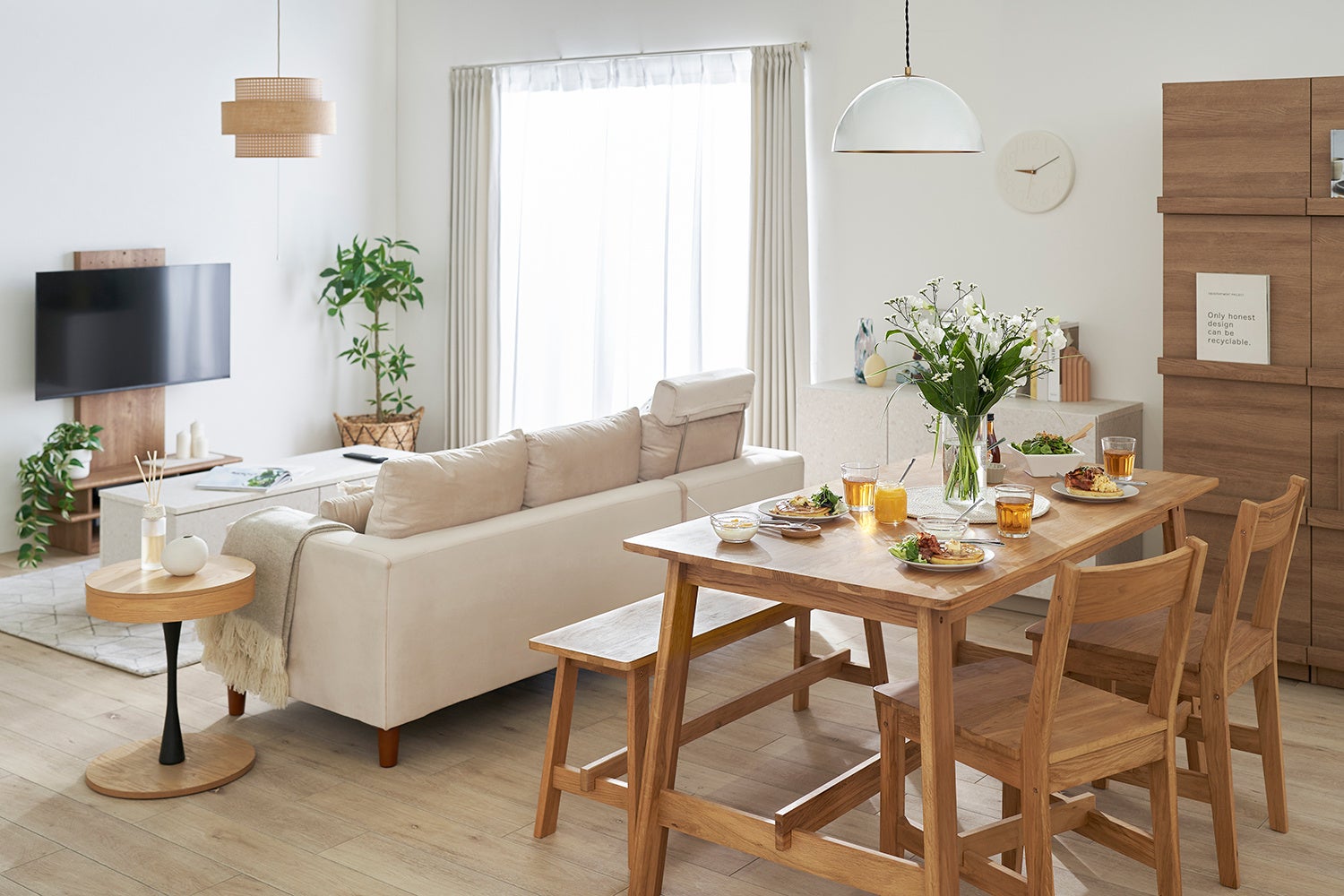 アイボリーのカラーリングソファをメインとした北欧×ナチュラルなMIXテイスト。ところどころにゴールドがアクセントの雑貨や照明を配置することでよりおしゃれに、そして全体的に木製の家具を使用し温かみのあるリビングダイニング空間に。