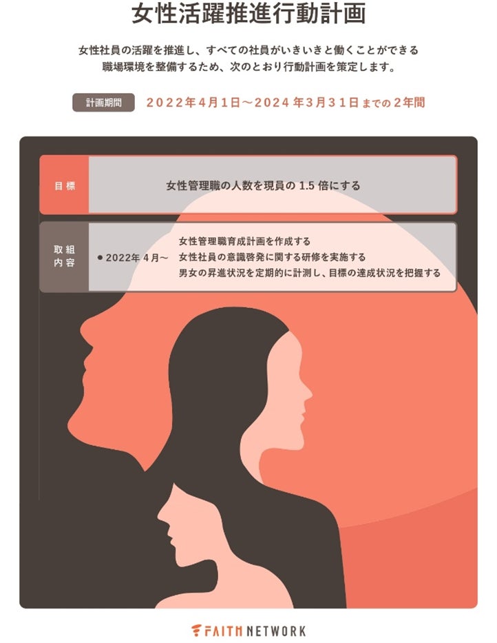 東京の城南3区エリア(世田谷区・目黒区・渋谷区)を中心に、主に新築一棟RCマンションによる不動産投資支援事業を展開する株式会社フェイスネットワーク(本社:東京都渋谷区、代表取締役社長:蜂谷 二郎、以下当社)は、この度、「女性の職業生活における活躍の推進に関する法律」(以下「女性活躍推進法」)に基づき、行動計画を策定しました。