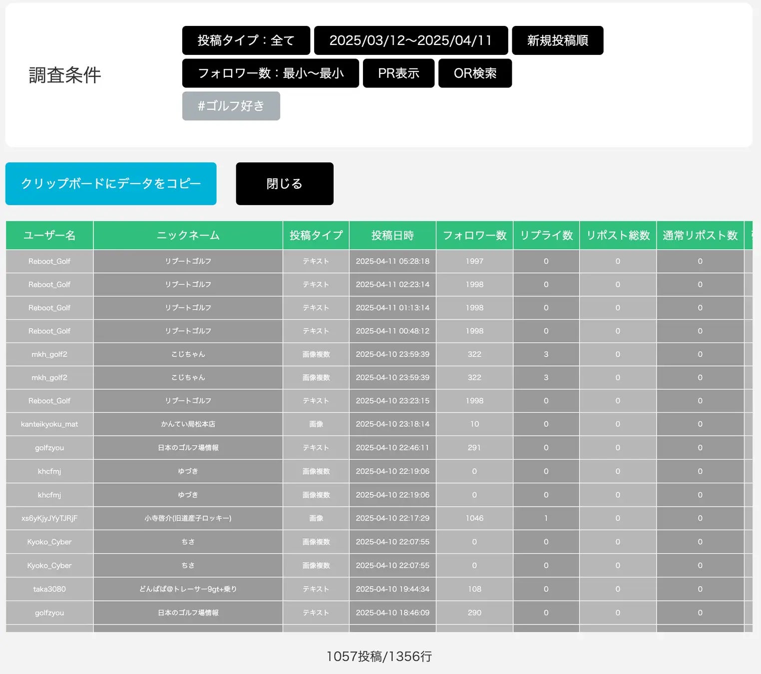 「ポスとる」は、X(旧Twitter)における投稿ごとのインプレッション数・エンゲージメント指標を自動で集計し、CSV出力による二次分析を可能にするツールです。