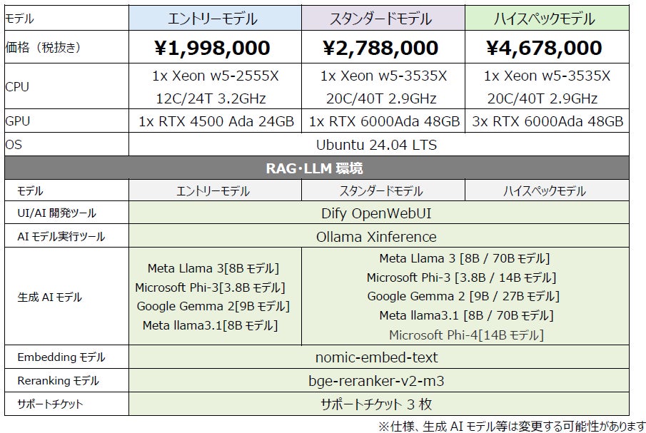 LLM/RAGの開発環境プリインストールだけではなく導入Q&Aチケットも付帯して、エントリーモデルが1,998,000円(税別・送料別)からという手頃な価格設定としています。ビジネスへのAI活用をスムーズにスタートできます。 -