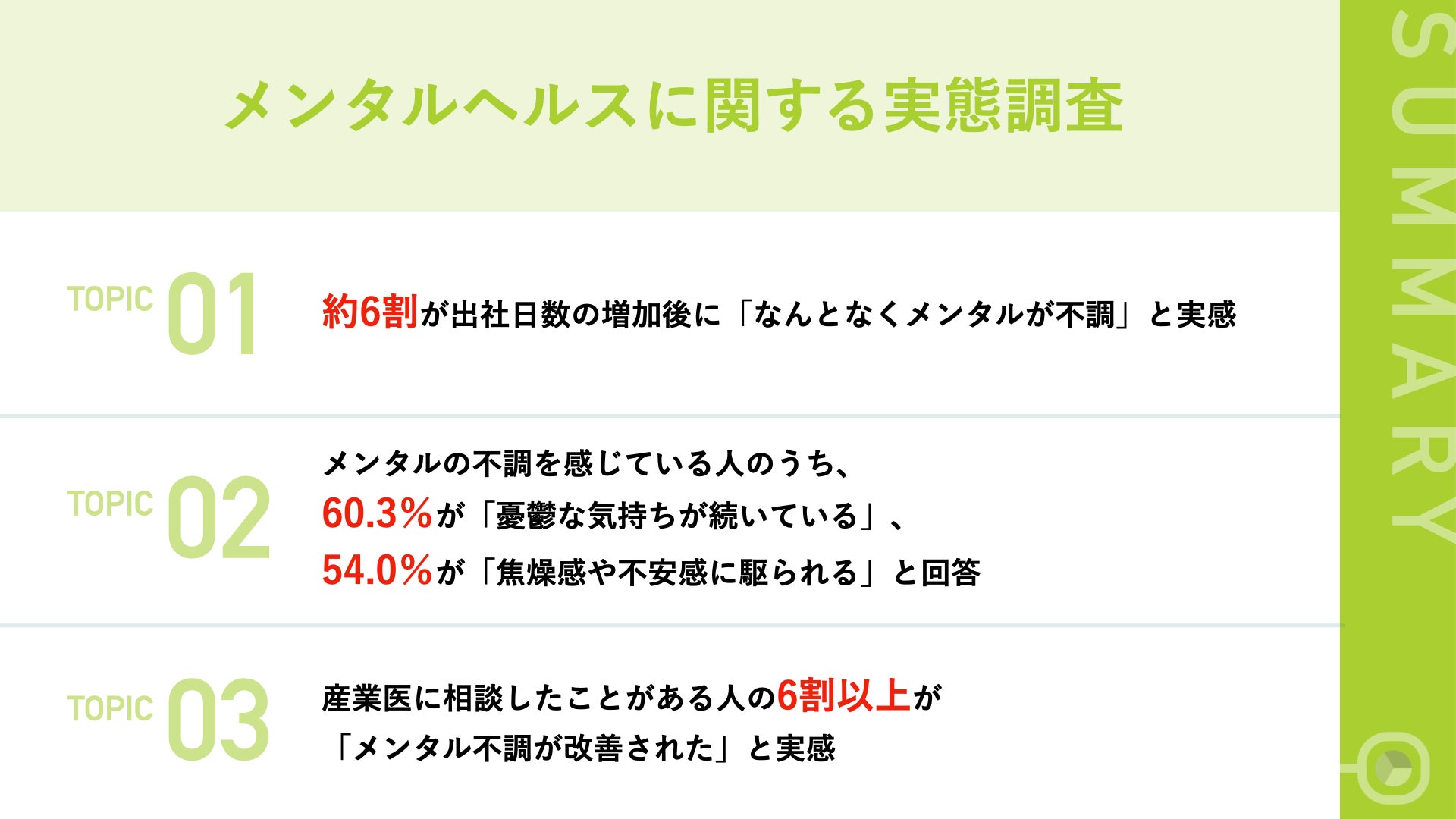 【5類移行で働き方に変化があった会社員にメンタルヘルス調査を実施!】約6割が働き方の変化にメンタル不調を感じ、産業医に相談経験あり