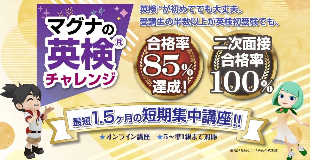 その第一歩として2025年に開講した「マグナの英検®チャレンジ講座」では、すでに確かな成果が生まれています。はじめて英検®に挑戦する小学生が多数を占める中、5級・4級コースで合格率85%を達成。さらに小学3年生2名が高校卒業レベルの英検®2級に一発合格し、二次試験(面接)の合格率は100%を記録しました。アプリで楽しく英語に親しんだ子供たちが、短期集中の講座を経て英検®合格という成功体験を得る ― この流れが、まさにマグナが描く「自己効力感の育成」の実践例です。