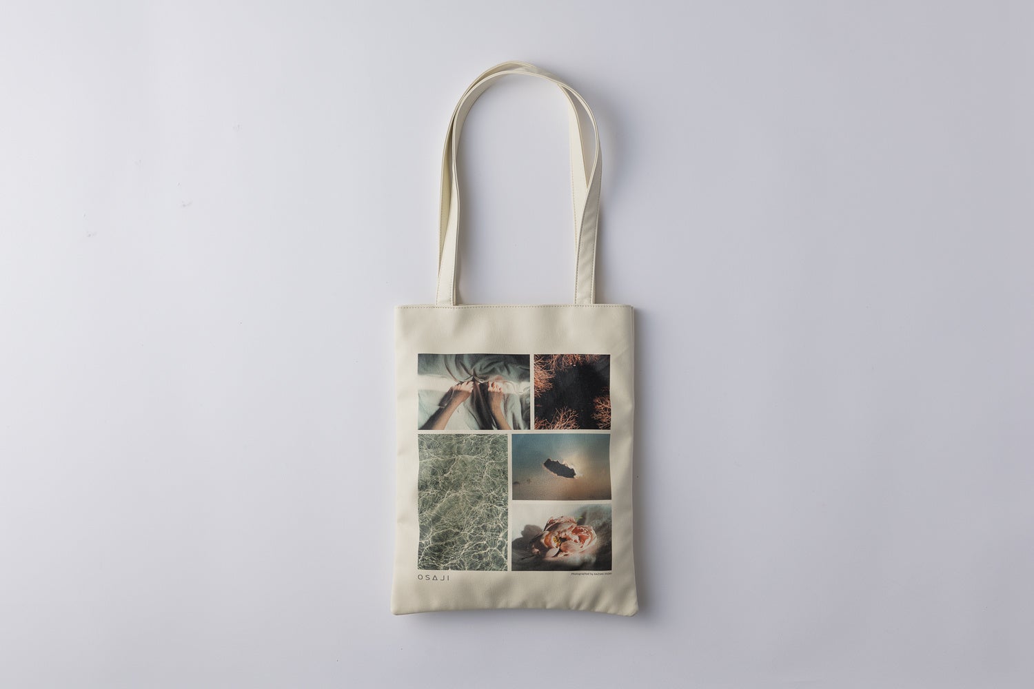 A4サイズもしっかり入るフェイクレザー素材のトートバッグです。2022年ホリデーコレクションのパッケージやビジュアルを担当した写真家・日置一輝氏の撮り下ろしカットを大胆にプリント。ふとした瞬間を切り取った印象的な写真たちが、日々のコーディネートに彩りを添えてくれます。