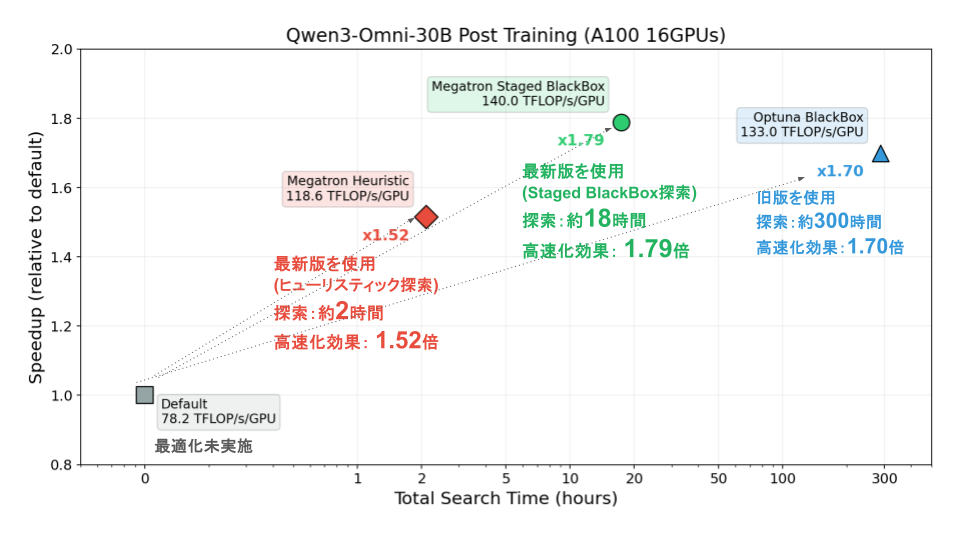 フィックスターズは今回、Megatron Coreの並列化戦略に関するドメイン知識を活用したハイパーパラメータ探索に、2種類の独自アルゴリズムとしてヒューリスティック探索とStaged BlackBox探索を新たに実装しました。NVIDIA A100×16GPU環境でQwen3-Omni-30Bの事後学習(SFT)を対象に実施したベンチマークでは、以下の成果を確認しています。