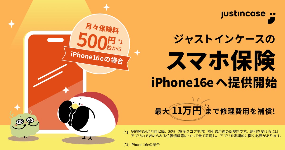 株式会社justInCase(以下、「当社」)は、 iPhone 16e の発売日(日本時間2025年2月28日)当日より、スマホの破損や盗難・紛失を補償する「スマホ保険」(正式名称:モノ修理費用保険)を提供いたします。