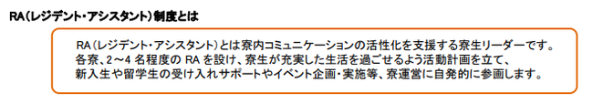 その推進のために、寮生活におけるリーダーであるRA(レジデント・アシスタント)の育成と支援に6年前より注力しています。