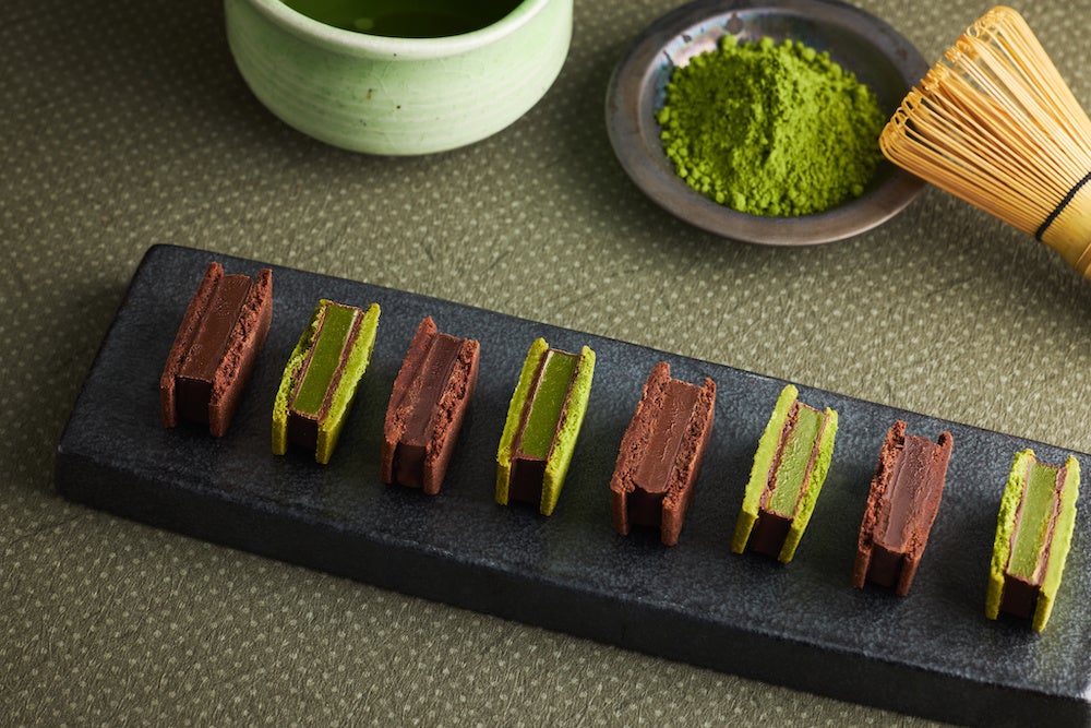 横浜市内の工房で作る自社オリジナルのホワイトチョコレート&ビターチョコレートを使用しています。ホワイトチョコレートは厳選したカカオバターを使い、優しい甘みで抹茶の香りを引き出す味わいに仕上げました。ビターチョコレートはガーナ産とエクアドル産カカオをブレンドしたこだわりのビターチョコレートです。抹茶のほろ苦さとチョコレートのマリアージュが楽しめるようなバランスを試行錯誤しました。クッキーは、今回のコラボレーションで初めて宇治抹茶をふんだんに使いました。1枚1枚丁寧に焼き上げ、焼き色も細かく見極め選定したこだわりのクッキーです。