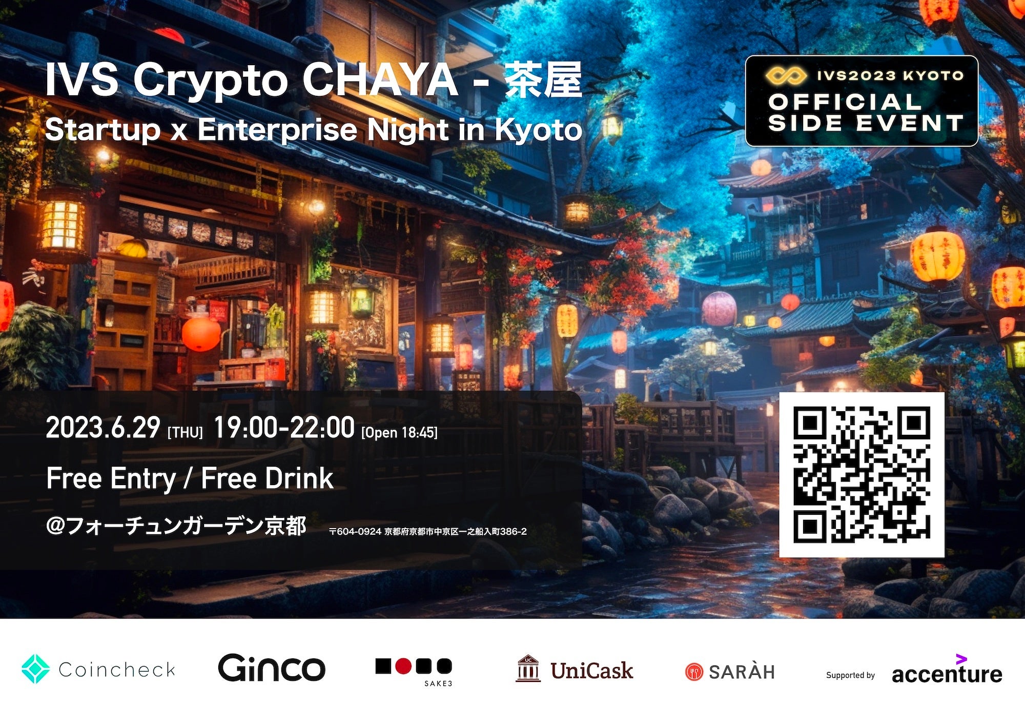 IVS Crypto CHAYA - 茶屋は、IVS / IVS Cryptoに参加される皆様なら誰でも参加できる、Startup×Enterpriseのサイドイベントです。京都の夜に大人が一息つきながら、参加者同士でコミュニケーションが取れる空間を提供いたします。SAKE3さんによる日本酒提供、UniCaskさんによるラム酒提供、SARAHさんによる手土産提供を予定しております。たくさんのサイドイベントが同時に開催されておりますので、ほっと一息着く場所として、お立ち寄りください。