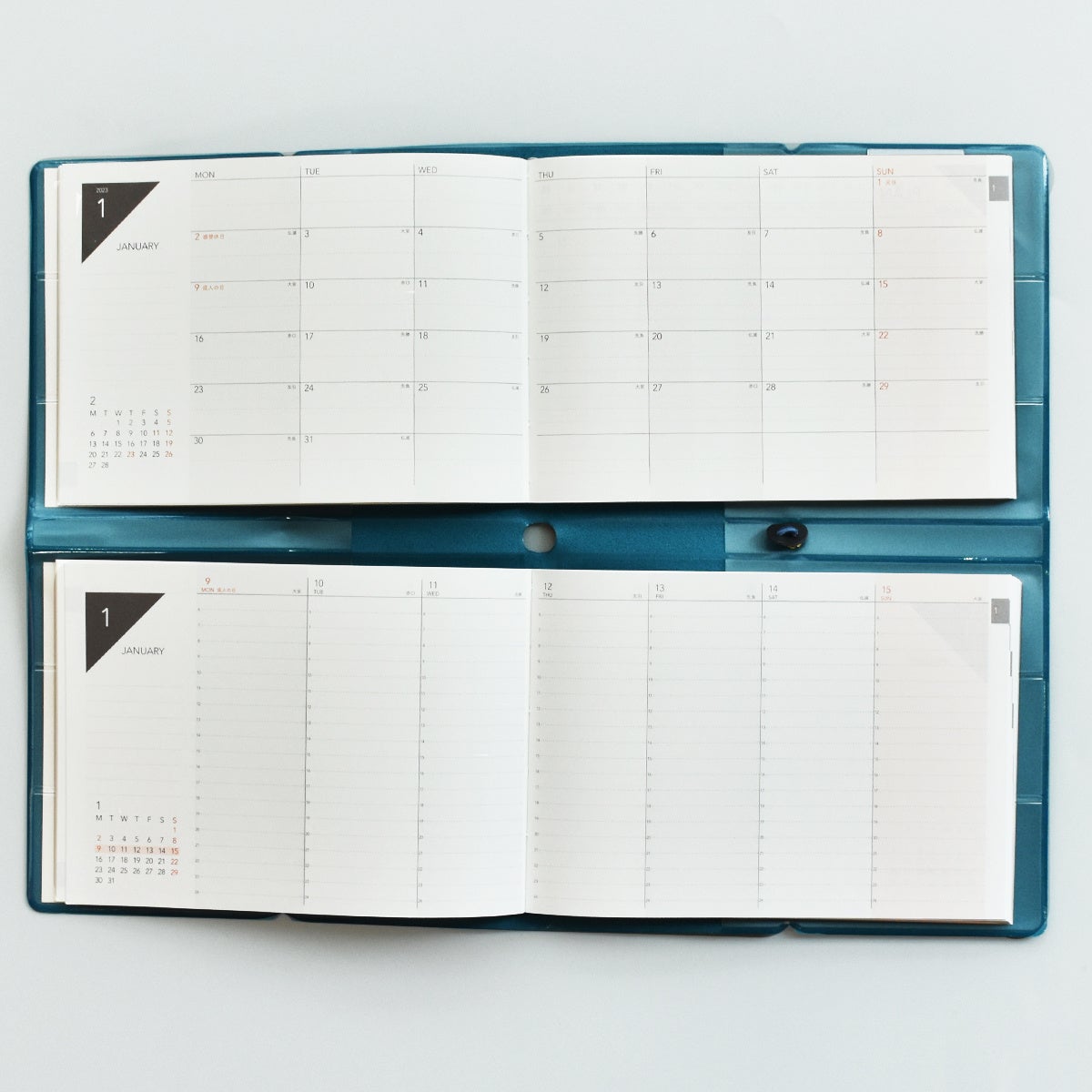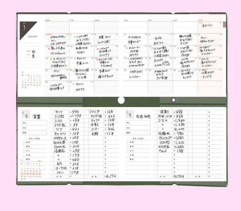 月間カレンダーと家計簿部分を切り分け、手帳カバー内に月間カレンダー手帳と家計簿帳がセットされています。これにより月の予定と支出記録・管理をページ間の移動なく同時に確認する事が可能です。