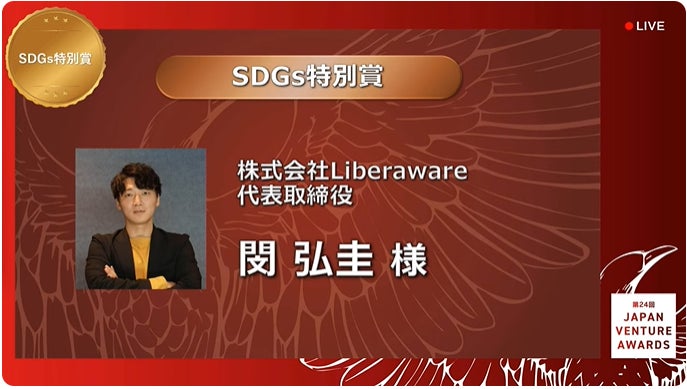 株式会社Liberaware(本社:千葉県千葉市、代表取締役 閔 弘圭、以下「当社」)は、2024年12月11日に開催された独立行政法人中小企業基盤整備機構が主催する「第24回 Japan Venture Awards(以下、JVA)」において、「SDGs特別賞」を受賞いたしました。