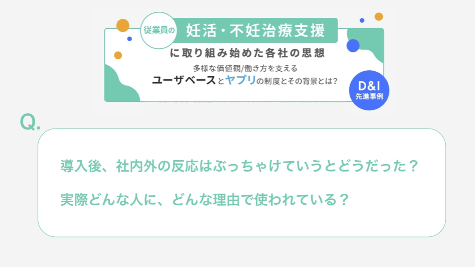 社内からの反響は大きく、導入から約4ヶ月で20組以上から相談がきました。パートナーと一緒にセミナーに参加し、早期に妊活の必要性に気づいた方もいらっしゃいます。こういう機会があって本当に良かったという声を多くもらっていますね。