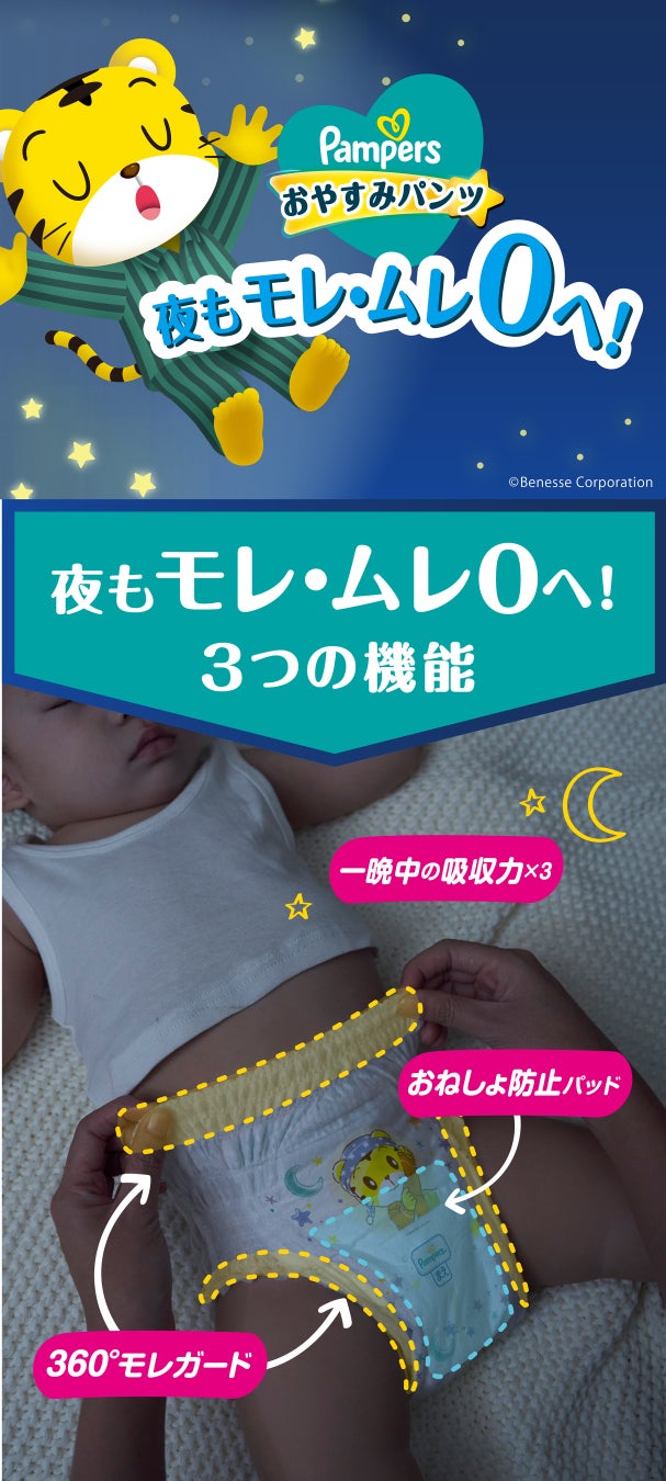 おねしょ防止パッドを採用し、一晩中のおしっこを受け止めます。パンパース史上最高の吸収力*4で、最長12時間モレを防止。