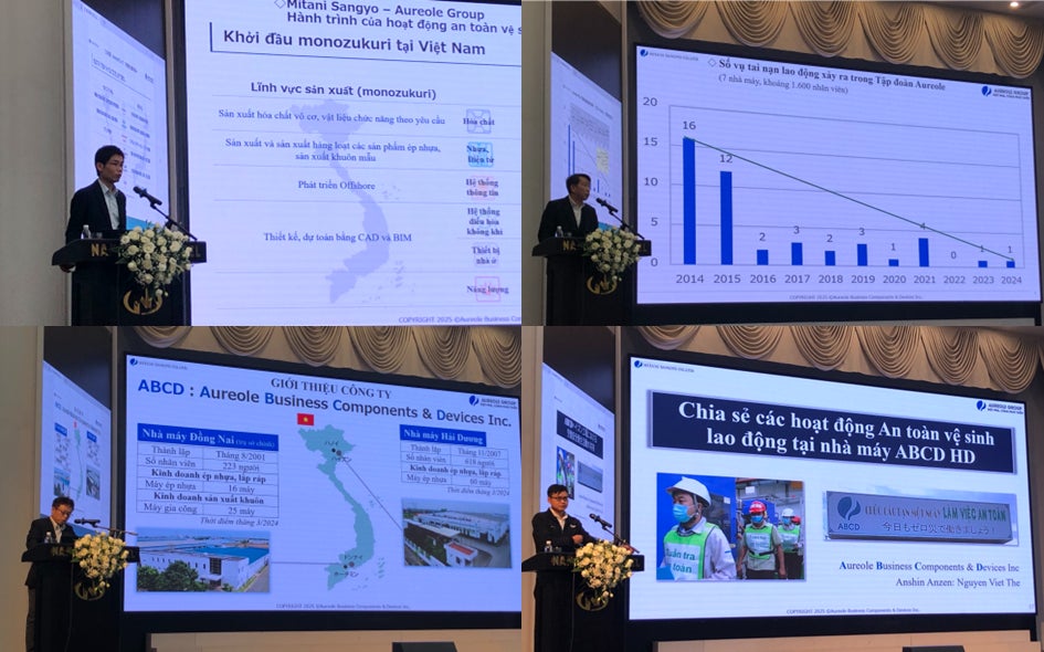 三谷産業株式会社(本社:石川県金沢市/代表取締役社長:三谷 忠照、以下 三谷産業)および三谷産業のベトナム子会社であるAureoleグループの2社は、特別民間法人中央労働災害防止協会(以下 中災防)が本年1月14日~15日にベトナム北部のハイズン省で開催した「第5回日系企業安全衛生担当者情報交流会」に協力し、ベトナムに所在する日系企業の安全管理担当者を対象に、三谷産業グループにおける安全活動の取り組みを紹介するとともに、樹脂成形品・電子部品の製造・組立工場の見学を実施しました。