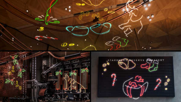 11月よりスタートした、サンタクロースや動物たちがレーザーで天井に映し出される「レーザーイルミネーション」に加え、12月2日(月)からは、音楽に合わせてイルミネーションが動き出す光とコーヒーの音のエンターテインメント「レーザーイルミネーション ショー」を1日に2回開催します。