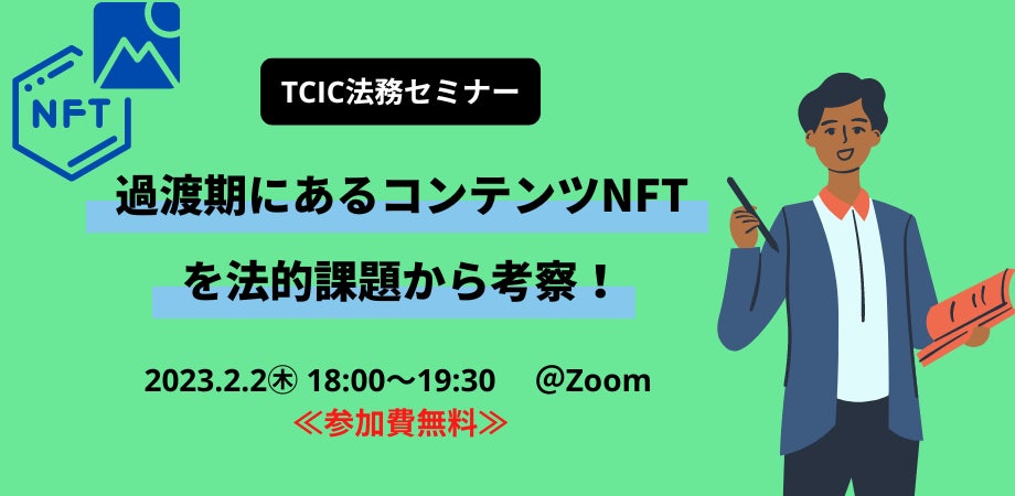 株式会社ツクリエ(本社:東京都千代田区、代表取締役:鈴木英樹)が東京都より運営受託をする、東京コンテンツインキュベーションセンター(以下、TCIC)は、TCIC知財セミナー『NFTビジネスにおける知的財産権の最新動向と課題』を1月26日(木)、TCIC法務セミナー『過渡期にあるコンテンツNFTを法的課題から考察!』を2月2日(木)に開催します。