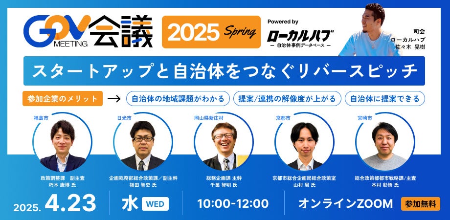 民間企業との連携を前向きに推進する全国の5自治体の自治体職員(ローカルハブ連携自治体)をゲストに迎え、企業に向けて課題発表をするリバースピッチイベント「GOV会議~2025Spring~」を開催します