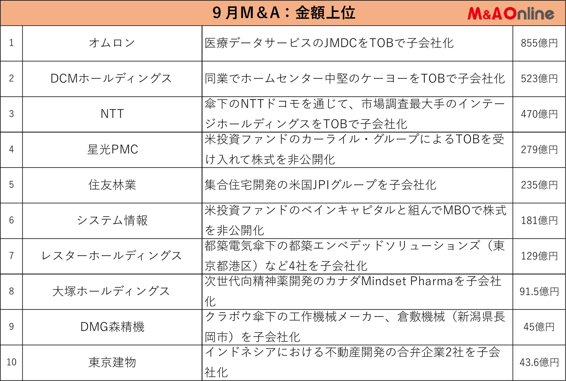 【9月M&Aレポート】77件、7カ月ぶりに減少 オムロンが大型TOB、DCMはケーヨーを子会社化