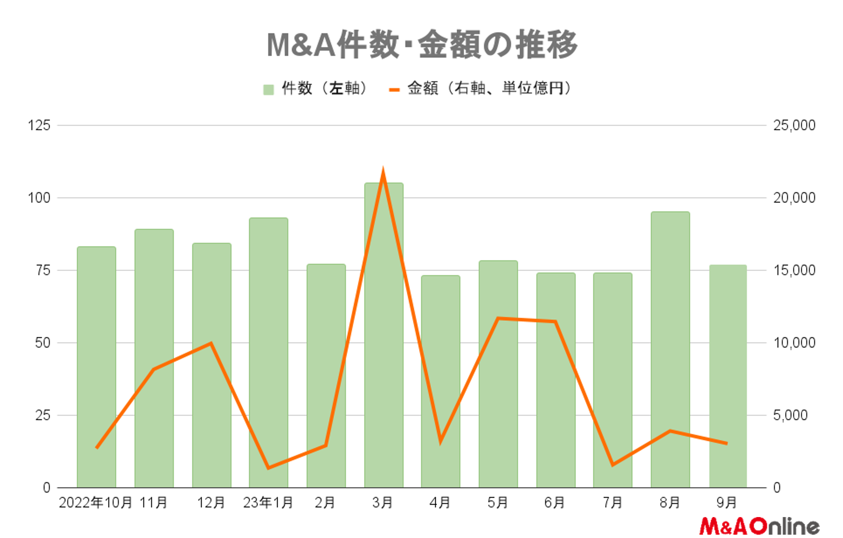 9月の総件数77件の内訳は買収65件、売却12件(買収側と売却側の双方が発表したケースは買収側でカウント)。このうち海外案件は13件で、日本企業が買い手のアウトバウンド取引9件、外国企業が買い手のインバウンド取引4件でした。
