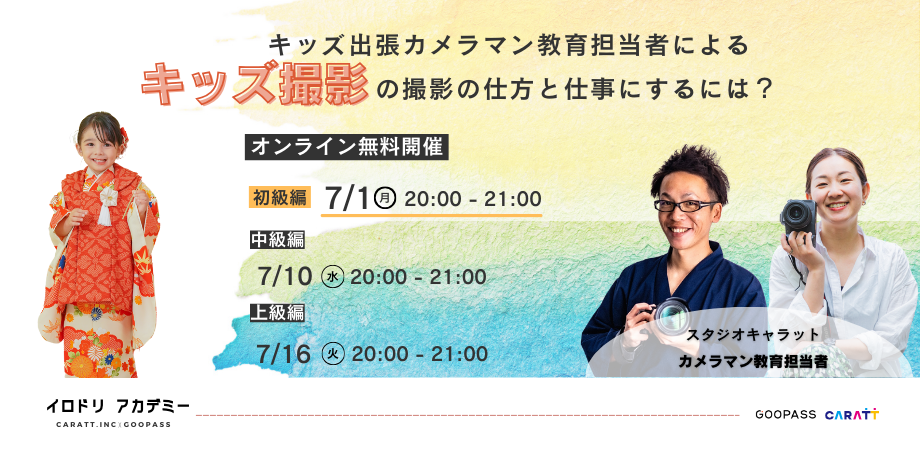 「キャラット」×「GOOPASS」趣味をきっかけに『イロドリアカデミー』500人以上教育!キッズ出張カメラマン教育担当者による「キッズ撮影」の撮影方法と仕事の極意【初級〜上級編】無料ウェビナー開催決定