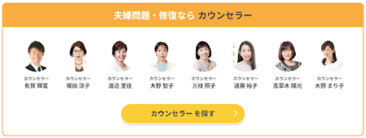 所属カウンセラーは、養成講座で夫婦カウンセリングの学びを経たカウンセラーのみ。9000件を超える実績を持つカウンセラーや、夫婦関係修復に強みを持つカウンセラーなどが在籍しており、あなた自身の悩みに寄り添うカウンセラーがきっと見つかります。離婚や再婚を経験しているカウンセラーも多く、さまざまな経験を重ねたからこそ語れるアドバイスを聞くことができます。
