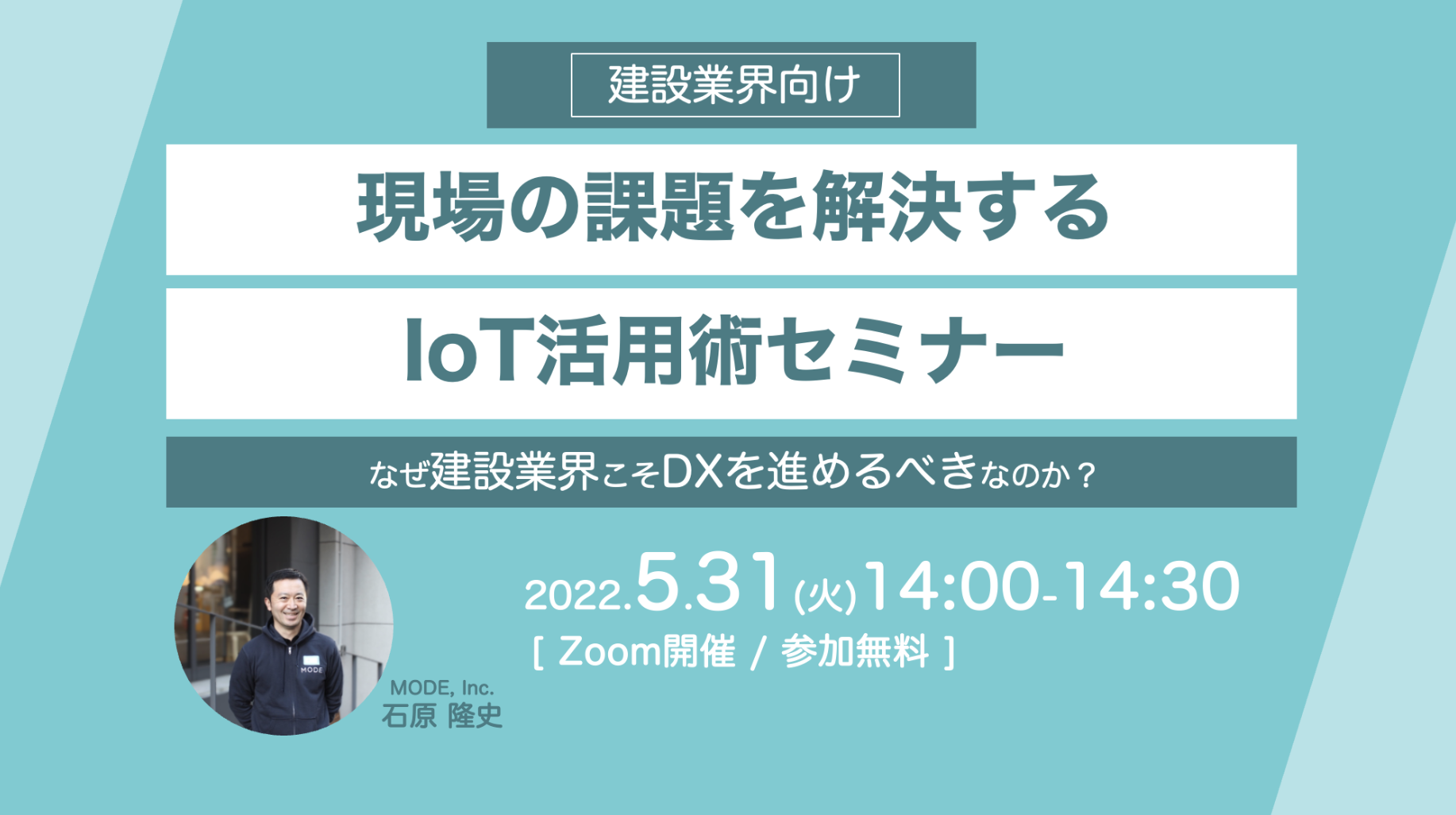 シリコンバレー発のIoT・コネクテッド関連のプラットフォームを提供するMODE, Inc.(本社:アメリカ合衆国・カリフォルニア州サンマテオ、CEO:上田 学、以下、MODE)は、建設業における現場の課題を解決するIoT活用術セミナーを2022年5月31日(火)に開催致します。