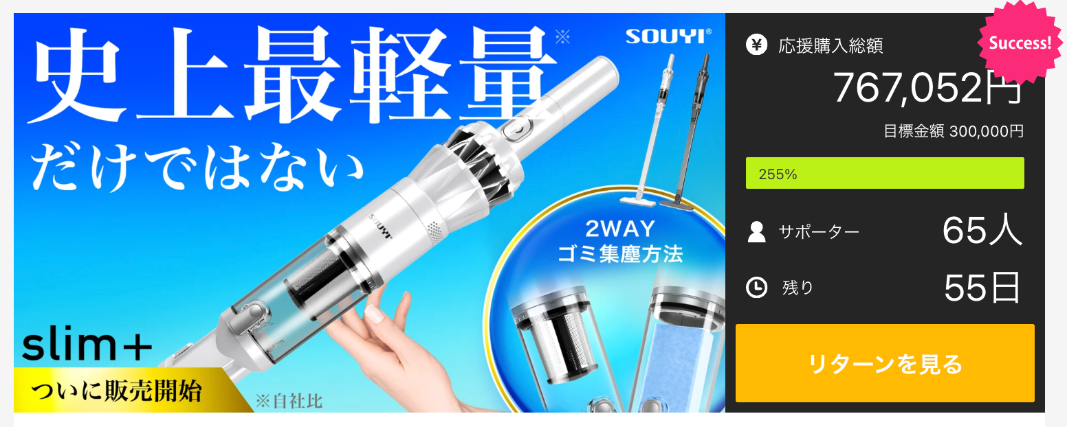 掲載開始初日で目標応援購入額を達成いたしました!URL : https://www.makuake.com/project/souyi_cleaner/