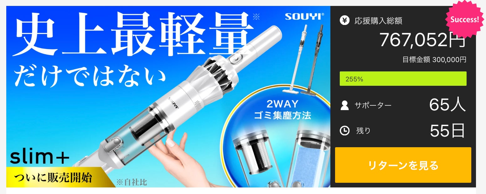 【新製品】コードレス・スリムクリーナー「 slim+ ( スリムプラス ) 」 がMakuakeにて掲載初日に目標応援購入額達成!