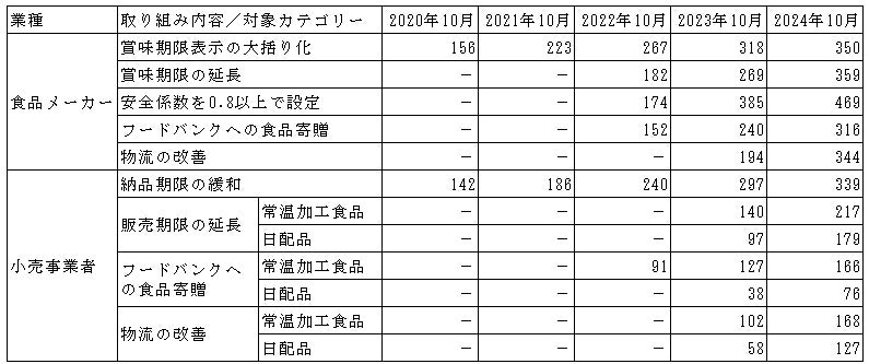 調査結果によると、納品期限を緩和する小売事業者(予定含む)は前年より42社増加し、339社に達しました。また、賞味期限表示を大括り化した食品メーカーも32社増の350社となっています。さらに、賞味期限の延長に取り組む食品メーカーは90社増の359社に、国の推奨に従って安全係数を0.8以上で設定するメーカーは84社増の469社に上っています。